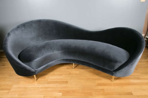 A comfortable and stylish sofa with a unique curved silhouette. The fabric is in great condition, with a neutral color that fits any palette. This item is part of our ongoing used furniture consignment collection. It’s ready to become the centerpiece of your living room.