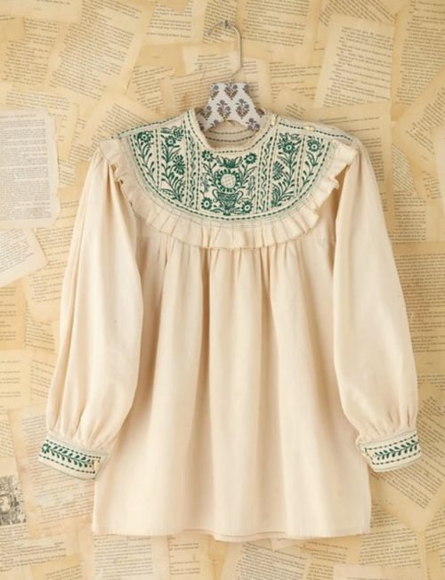 Discovered in our vintage clothing store section, this blouse features intricate embroidery and a classic cut. It is made from a natural, breathable fabric. A unique statement piece to elevate your wardrobe.